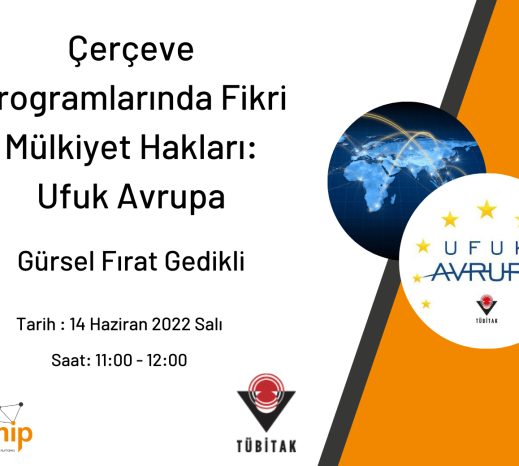 14 Haziran 2022 Salı günü 11:00-12:00 saatleri arasında "Çerçeve Programlarda Fikri Mülkiyet Hakları: Ufuk Avrupa" konulu Webinar gerçekleştirilecektir. TÜBİTAK Uluslararası Dairesi'nden Sn. Gürsel Fırat Gedikli bizleri bu konuda bilgilendirecektir.