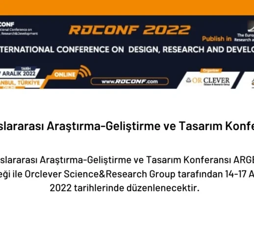 II.Uluslararası Araştırma-Geliştirme ve Tasarım Konferansı ARGEMİP desteği ile Orclever Science&Research Group tarafından düzenlenecektir. Uluslararası yayın olanakları sunan, Üniversite Sanayi iş birliği hedefiyle Ar-Ge ve Tasarım Merkezlerini, akademisyenler ve araştırmacılar ile bir araya getiren; RDCONF 2022’ye 14-17 Aralık 2022 tarihleri arasında online olarak katılım sağlanacaktır.