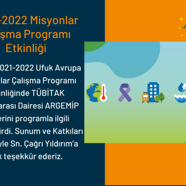 4 Mart 2021-2022 Ufuk Avrupa Misyonlar Çalışma Programı etkinliğinde TÜBİTAK Uluslararası Dairesi ARGEMİP üyelerini programla ilgili bilgilendirdi.